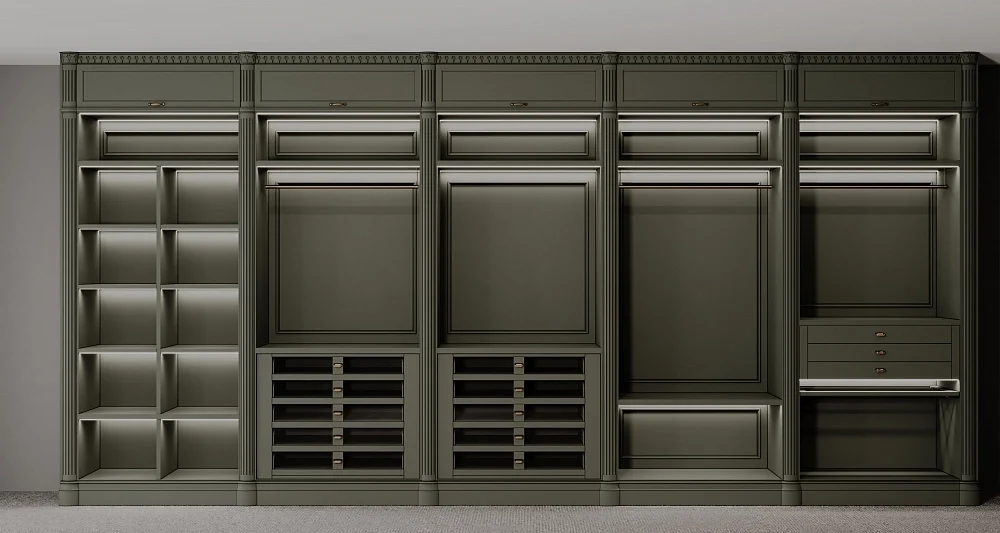 Tasarım. İki seçenek mevcuttur: yatak odası için modern bir gömme dolap veya bağımsız bir gardırop, diğer adıyla dolaplı gardırop. İlkinde tam boy bir dolap bulunmaz, tek bir duvarı veya özel olarak oluşturulmuş bir niş veya girintiyi kaplar. Bu modelde ise alt, üst veya yan duvarlar yoktur ve bunların yerine odanın duvarları kullanılır. Tasarım yalnızca ön panelden (çerçeve ve kapakların bağlı olduğu ön kısım) ve iç donanımlardan (raflar, bölme ayırıcılar ve askı çubukları) oluşur. Bağımsız bir gardırop ise tam boy bir dolaba sahiptir.