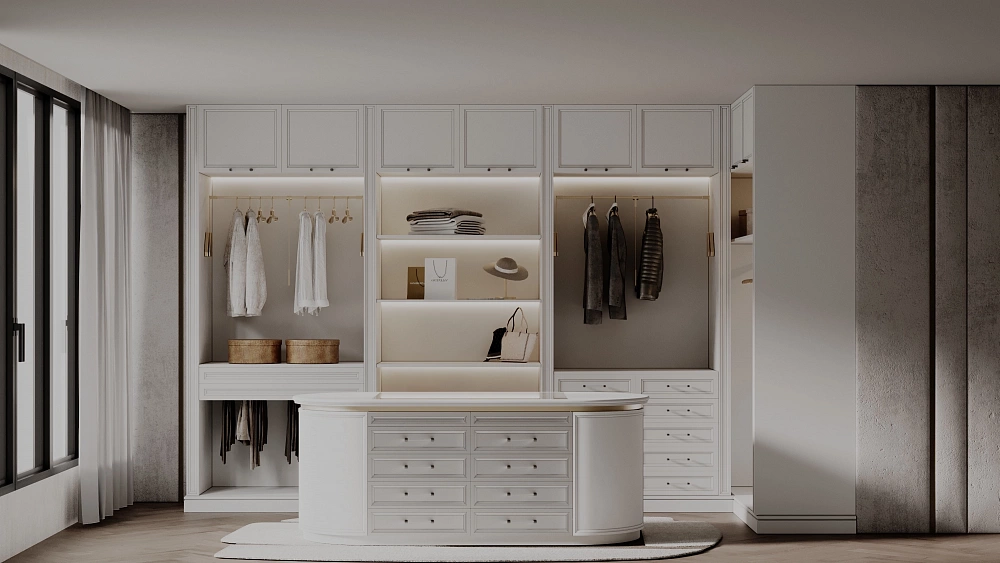Ceviz ağacının doğal damarlı yapısı, klasik giyinme odalarına asil ve sıcak bir atmosfer kazandırır.