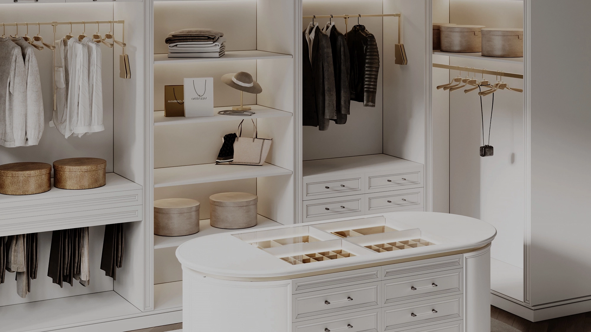Giyinme odasında kullanılan klasik kristal avizeler ve çerçeveli aynalar, mekânın ihtişamını artırır.
